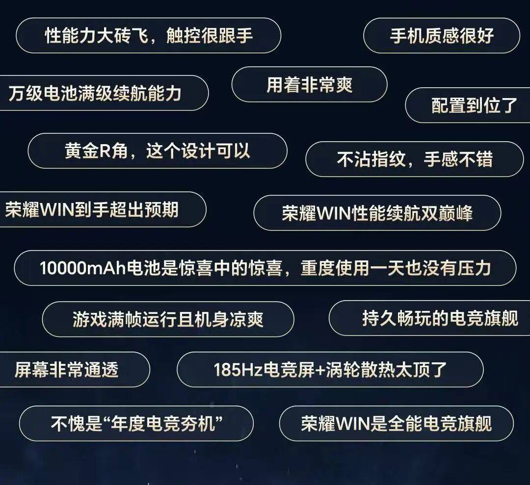 所以说,在荣耀WIN之前,市场上出现的是“电竞版手机”,而不是真正意义的“电竞手机”。无论是设计还是理念,荣耀都真正跳出了传统的模式。在社交媒体,那些已经真正实操过的用户,也纷纷表示“这才是游戏党要的硬货”“荣耀WIN这样的产品才配得上我”“不愧是年度电竞夯机”。