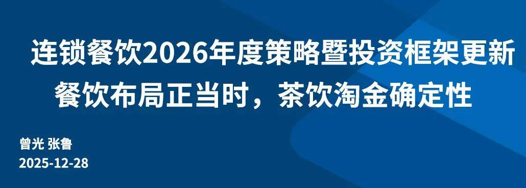 子行业分析与展望:1)现制茶饮:受益于本轮外卖补贴战,7家上市茶饮龙头2025H1收入&经调整净利润分别同增32.5%/58.0%,环比2024年(+22.5%/+15.0%)进一步提速。伴随外卖补贴渐进退坡,市场也在观望茶饮龙头26Q2/Q3面临基数压力时的应对思路。新产品线扩充如奶茶咖啡的相互渗透、产品的持续创新、新品牌曲线构筑是主要应对思路,伴随上市后品牌认知度提升+系列举措提升加盟商回报,头部集中趋势望继续演绎。2)餐饮:与咖啡茶饮赛道受益于外卖补贴战不同,2025H1上市餐饮龙头收入同增1.5%,慢于同期餐饮行业增速(+4.3%),主因价格降价内卷、高端餐饮政策扰动、预制菜舆论等多因素扰动,但2025H1归母净利润同增7.5%表征经营效能在改善。考虑到2026年餐饮龙头经营基数相对较低,伴随CPI数据反弹、潜在服务政策提振以及龙头持续创新举措,如收入端呈现更多惊喜经营杠杆作用下板块有望在低基数下迎来触底反弹。